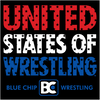 This bumper sticker has the ' United States of Wrestling ' slogan and the Blue Chip Wrestling Logo.